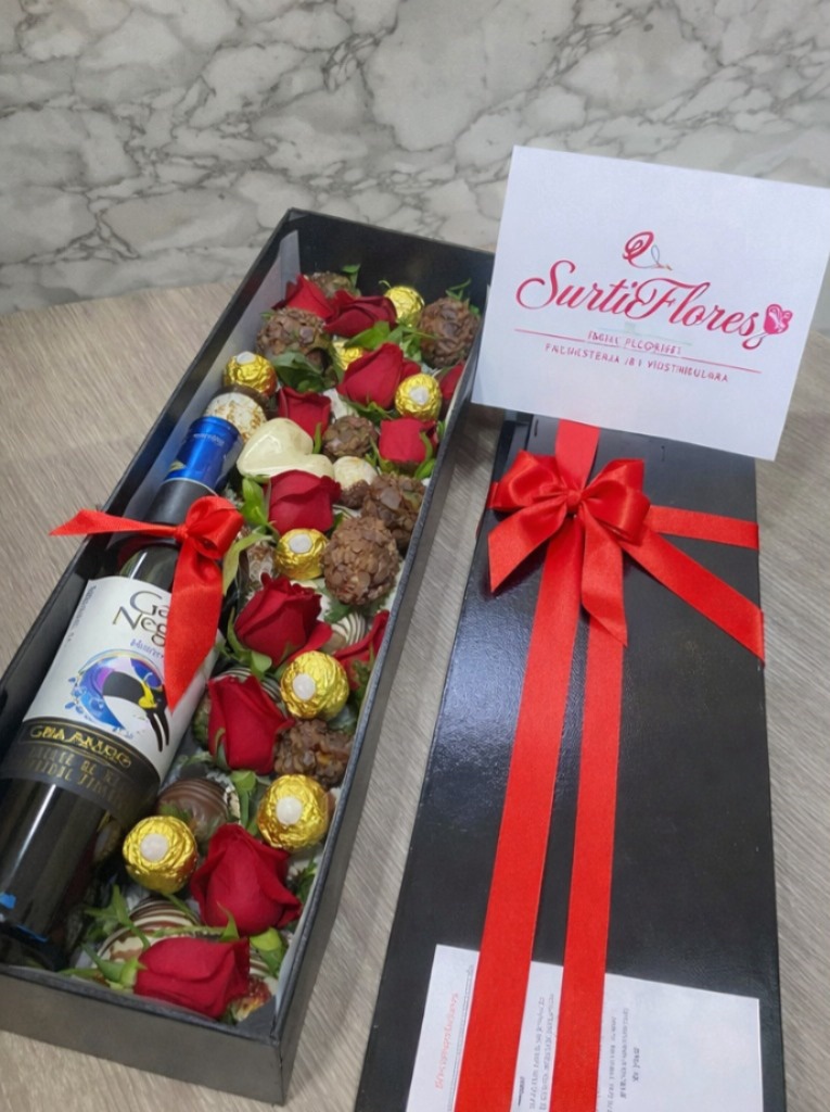 Hermosa caja de chocolate con fresas, incluye vino y hermosa caja decorada